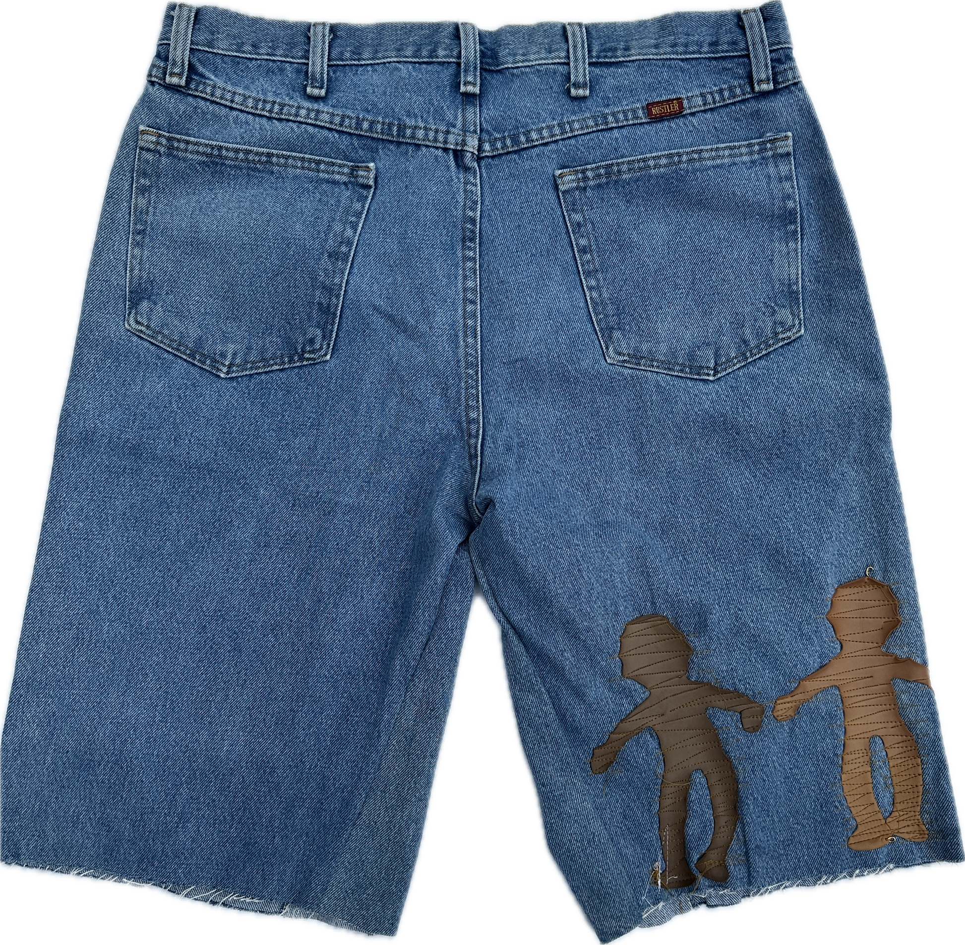 Classic denim cut with layered appliqué figures, gothic Saints branding, and a white stencil-style angel. Designed to carry both innocence and rebellion — streetwear storytelling through denim.