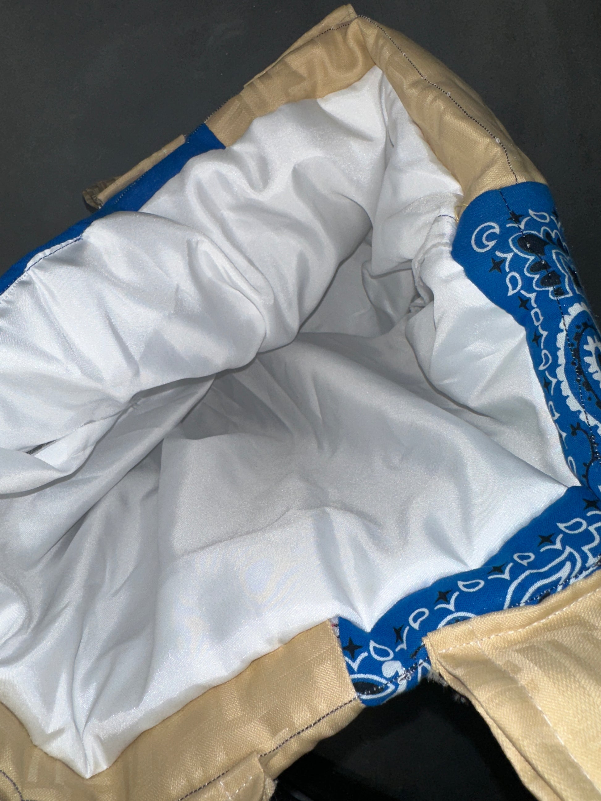 Carry your essentials in true TOAST style with the Bandana Patchwork Tote – Blue Sand Edition. This handcrafted bag fuses sandy beige tones with bold royal blue paisley bandana panels, creating a statement piece that blends rugged streetwear energy with everyday functionality. Lightly quilted for structure and comfort, it features sturdy handles, a spacious white satin-lined interior, and signature TOAS detailing. Perfect for a day in the city, a creative grind, or adding edge to any fit.