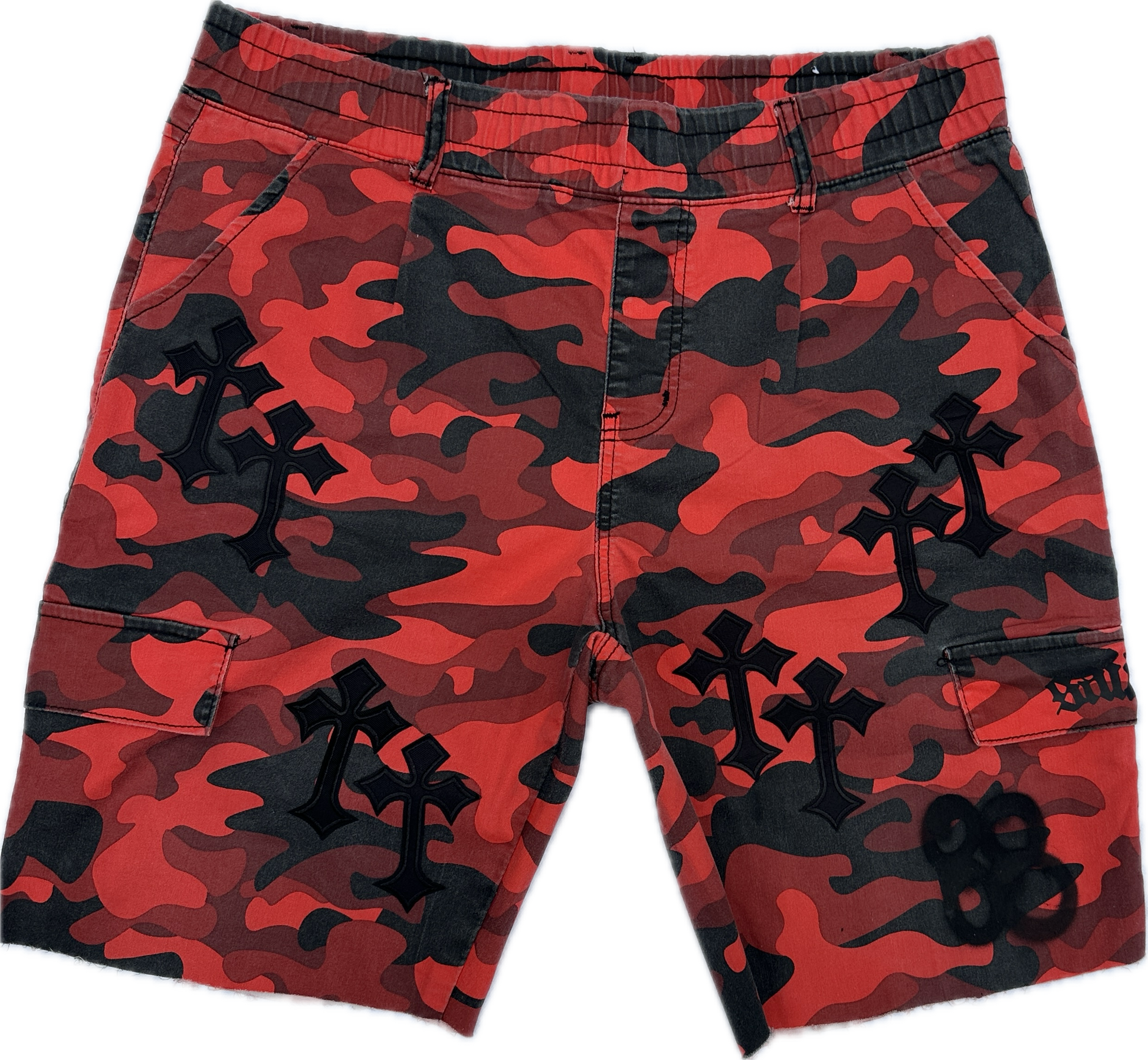 Red camo cargo shorts blasted with black gothic crosses and Saints “88” spray graphic. Heavy-duty, aggressive, and unapologetic — made for those who bring the fire wherever they move.