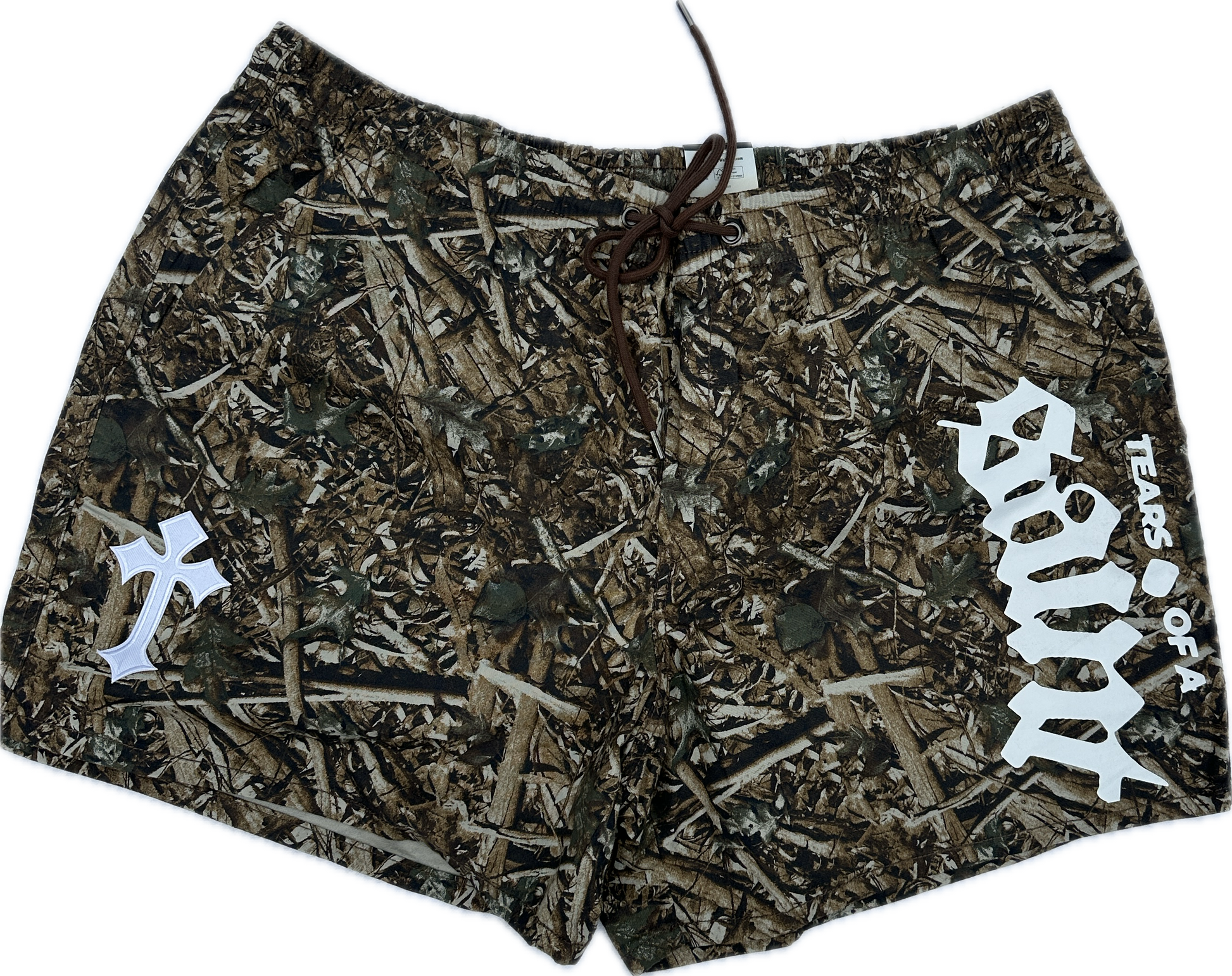 Classic camo reimagined with bold white Tears of a Saint branding and cross detailing. Mesh-lined with a drawstring waist, these are built for water, workouts, or straight flexing. Utility and edge in one piece.