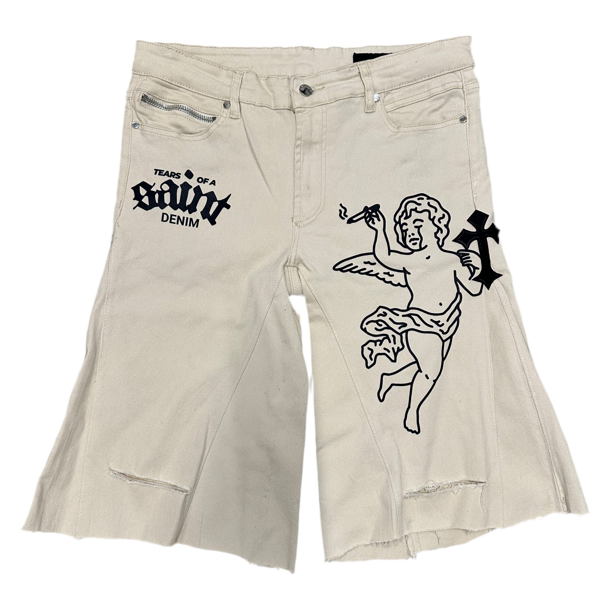 Off-white denim reworked with bold black graphics: a smoking angel clutching a cross and Tears of a Saint branding. Flared raw hems add vintage rebellion.
