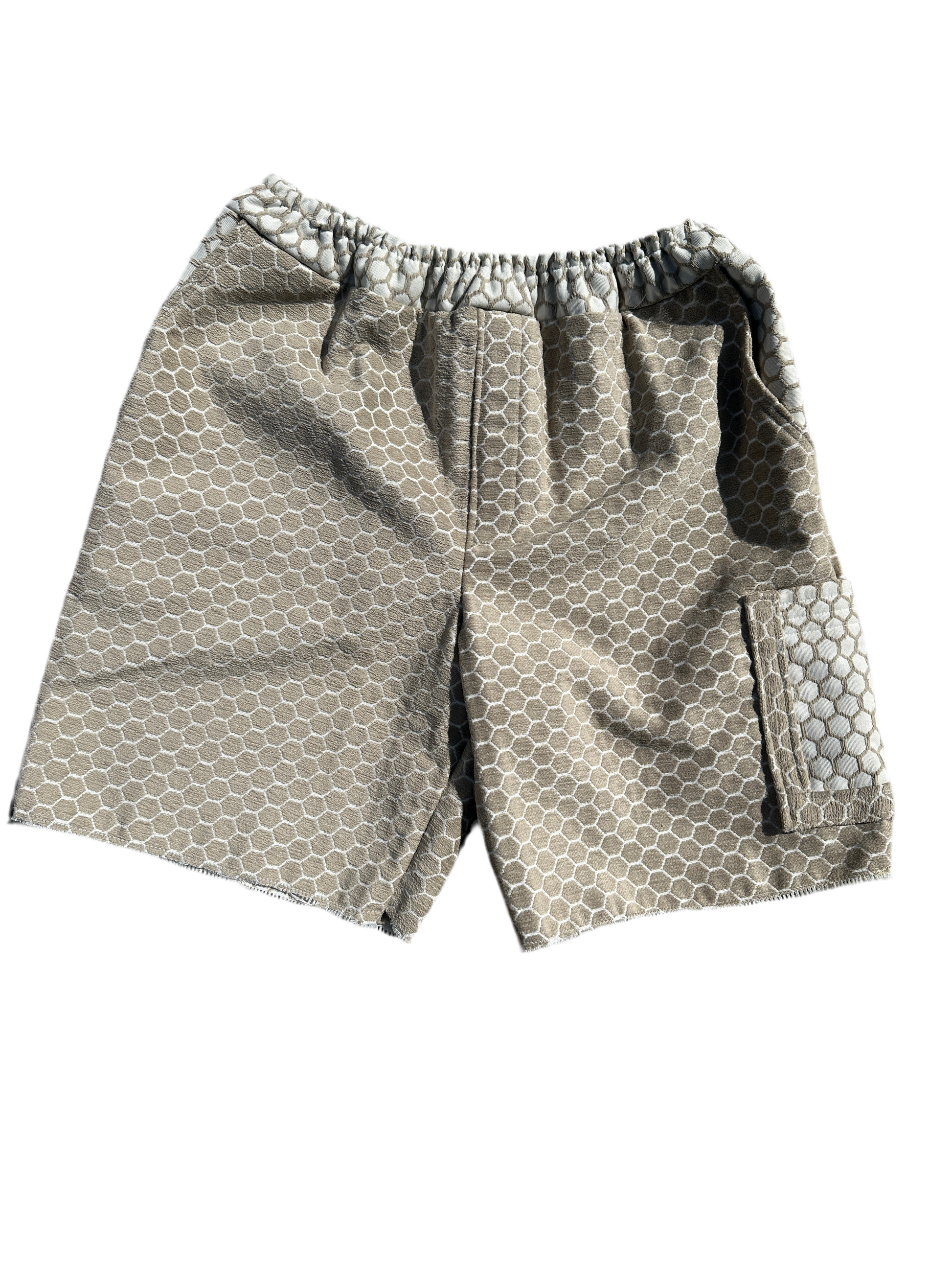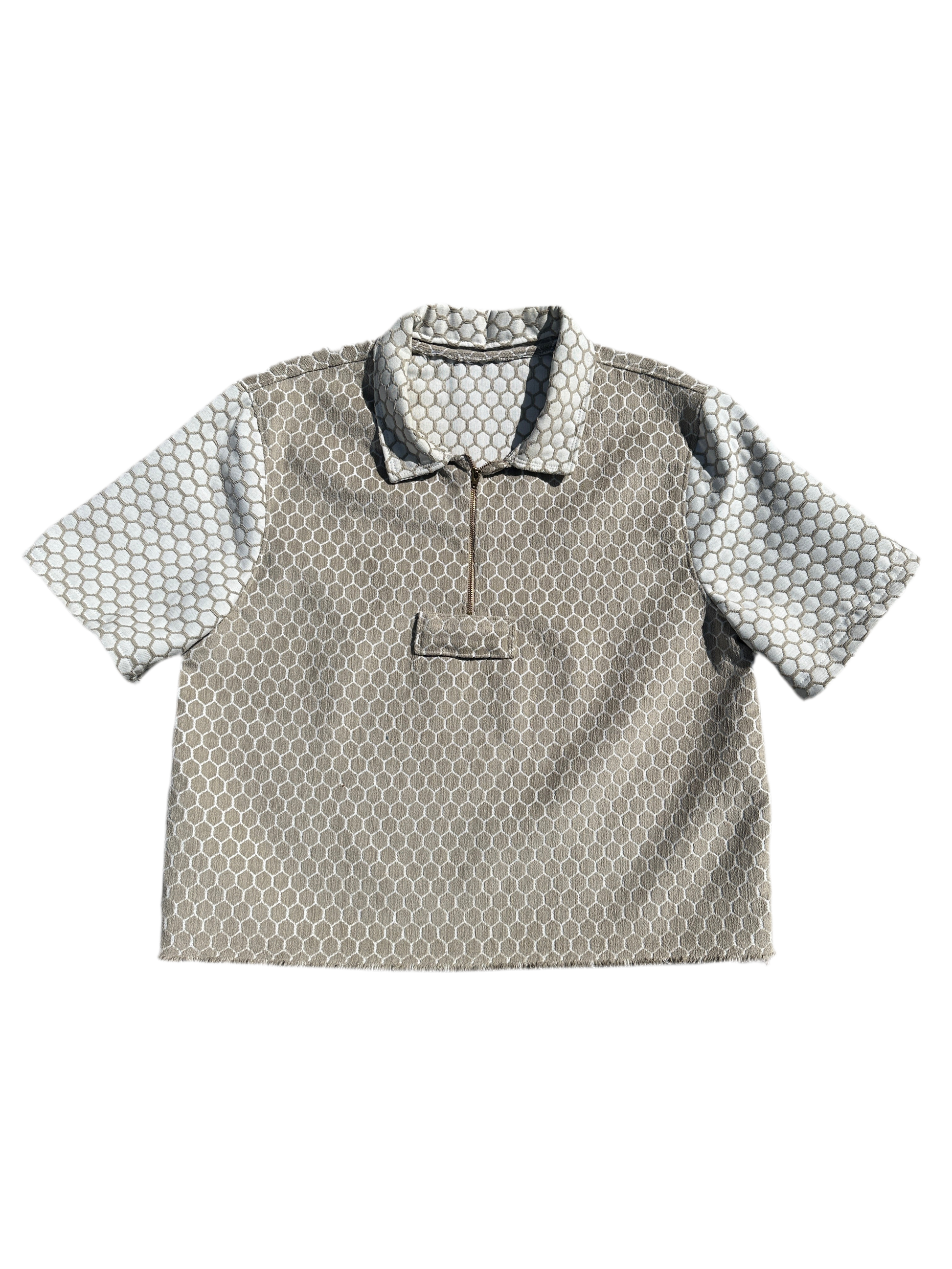 A futuristic khaki two-piece covered in hexagon patterning. Structured yet experimental, this set buzzes with energy—like armor born from the hive.
