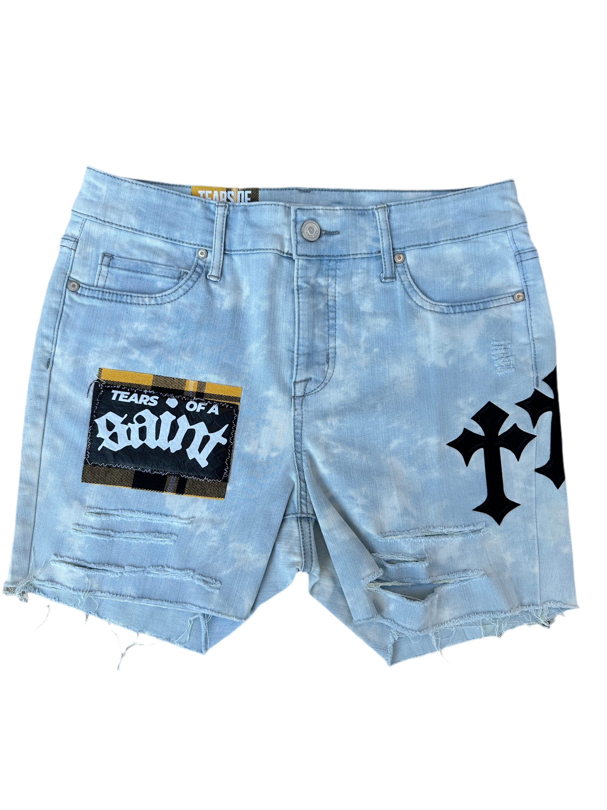 A cloudy bleach wash redefines classic denim. Black cross applique and bold “Tears of a Saint” patching seal the look. Distressed hems for a lived-in, eternal edge.