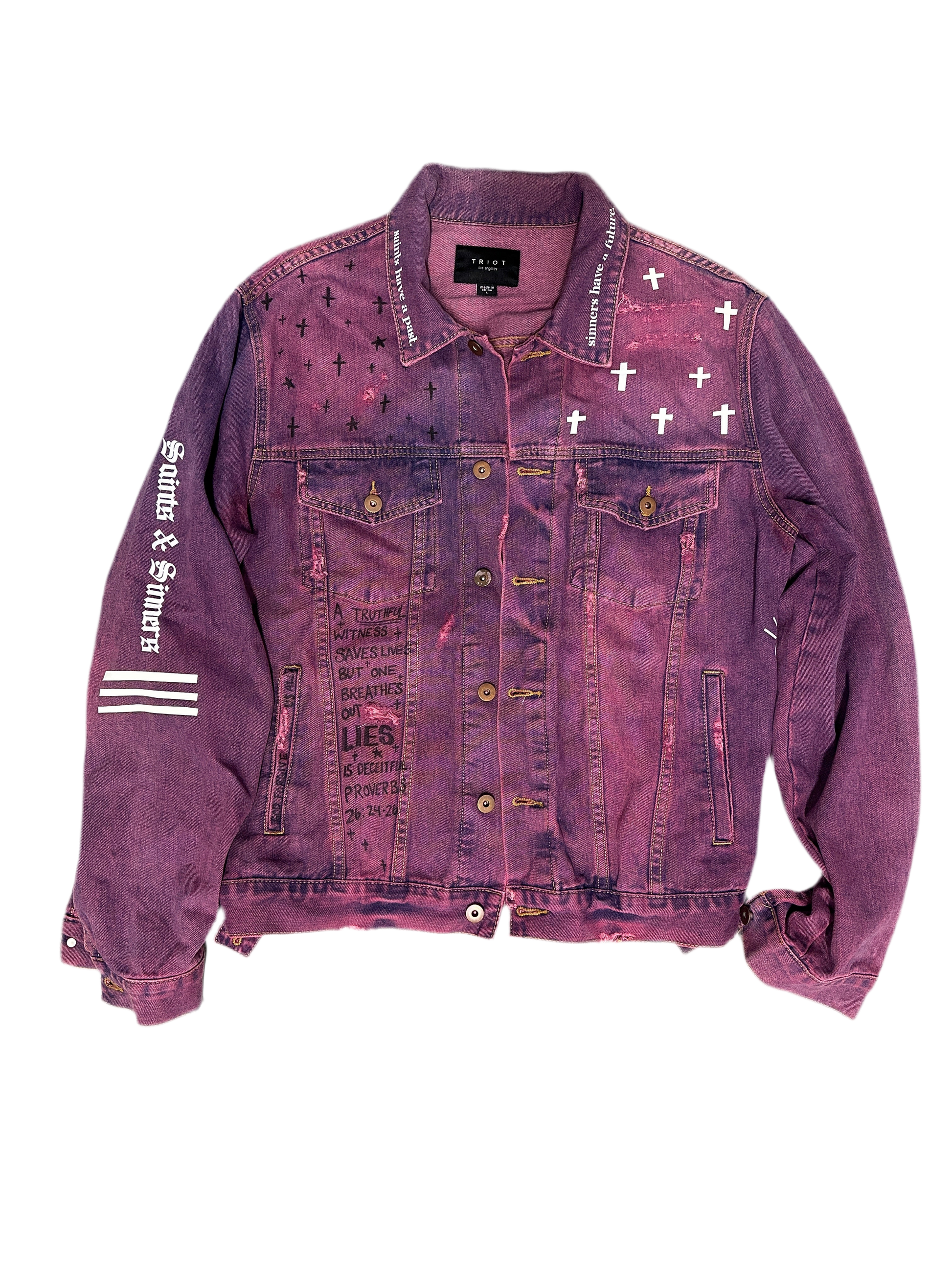 Gradient purple denim jacket + jeans, destroyed and patched with haunting graphics. Dark ombré tones meet raw-edge storytelling—a head-to-toe rebellion statement.
